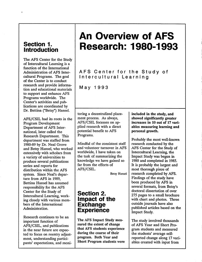 This document provides a broad view of the major research carried out by AFS until 1975, including the hypothesis and findings generated by them, the methods used and what other topics would be of interest for future study. Results of research have been grouped in this document into thirteen categories: Categories I-VII reflect program processes; Categories VIII-X concentrate on U.S. field units, international field units and the internal workings of the office; Category XI focuses on the environment external to AFS; Category XII concerns itself with the finances of the organization; and, finally, Category XIII presents a short bibliography of books written about the AFS experience.