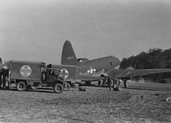 American Field Service ambulances evacuating patients to one of the strips in Central Burma, 1944