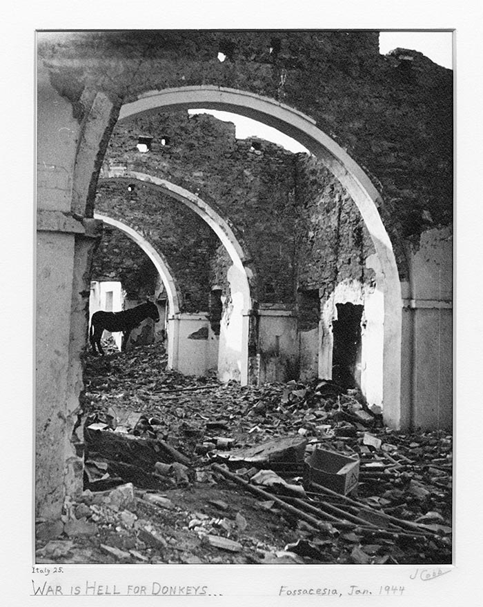 I think this might have been an office or a store, into which this ownerless donkey wandered. Except for the blurred memories that peak out from my photos like this one, I have blocked out almost all of the details of that part of the war. The scorched earth policy of the retreating German Army combined with the results of the many months of fierce fighting over every foot of the way from the Sangro to Ortona, have left few buildings intact and most civilians destitute.