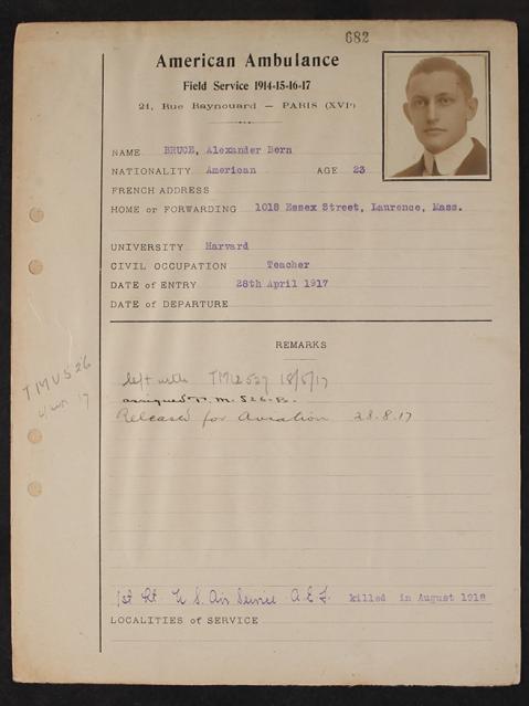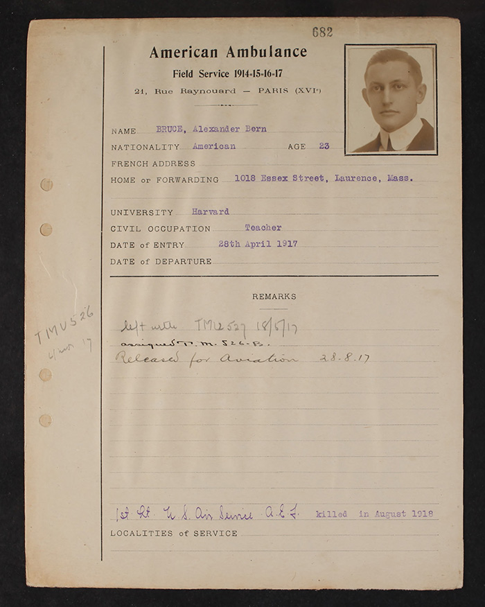 Born May 3, 1894, in Seattle, Washington. Son of David and Carrie Wainwright Bruce. Home, Lawrence, Massachusetts. Educated Phillips Academy, Andover, and Harvard University, Class of 1915. Teaching staff, Andover. Plattsburg, 1916. Joined American Field Service, April 28, 1917; attached Transport Section 526 to August 28, 1917. Enlisted U. S. Aviation. First Lieutenant; Paris Defense Squadron. Attached 94th Pursuit Squadron, July, 1918. Killed in combat, August 17, 1918, over Cruaux. Buried American Cemetery, Fismes, Marne.