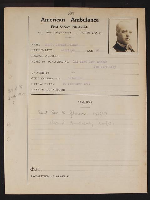 When America entered the War, King was too old to enlist in the regular army, so he chose at once the only other possible alternative for getting to France to aid that country for which he felt a very deep affection, fostered by blood ties. He enlisted with the American Field Service.