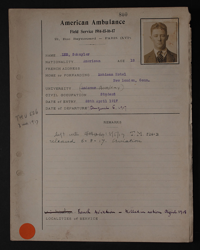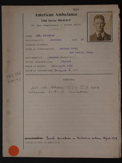 Born July 29, 1898, in Bloomfield, New Jersey. Son of Reverend J. Beveridge and Mynna Greenman Lee. Home, New London, Connecticut. Educated German-English Academy, Milwaukee (Wisconsin); Latin School, Chicago; Haverford School, Pennsylvania, and Phillips Academy, Andover, Class of 1918. Joined American Field Service, April 28, 1917; attached Transport Section 526 to August 6, 1917. Enlisted French Aviation, Lafayette Escadrille. Breveted October 22, 1917. Trained Avord, Tours, Pau, and le Plessis-Belleville. Caporal, Spad Escadrille 96, January 10, 1918. Shot down and killed, April 12, 1918, east of Montdidier, Somme. Croix de Guerre with palm, and two citations. His grave has not been found.