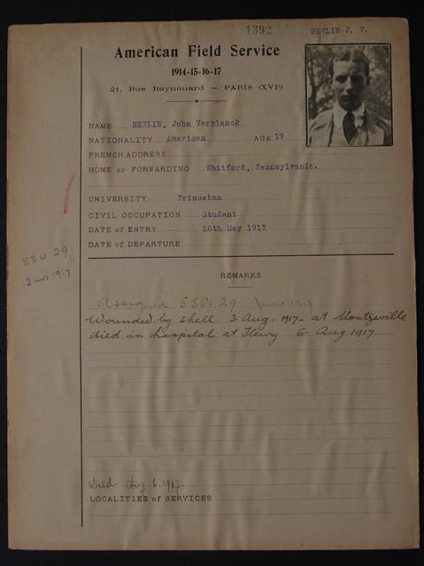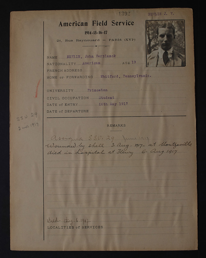 Born May 16, 1898, in Ardmore, Pennsylvania. Son of Richard M. and Alice Eisenbrey Newlin. Home, Whitford, Pennsylvania. Educated Haverford School, Pennsylvania, and Princeton University, Class of 1919. Plattsburg Camp, 1916. Joined American Field Service, May 26, 1917; attached Section Twenty-nine. Wounded August 3rd, Montzéville. Died of wounds, night of August 5, 1917. Croix de Guerre, Médaille Militaire. Buried Fleury-sur-Aire, Meuse. Body transferred to American Military Cemetery, Romagne-sous-Montfaucon, Meuse.