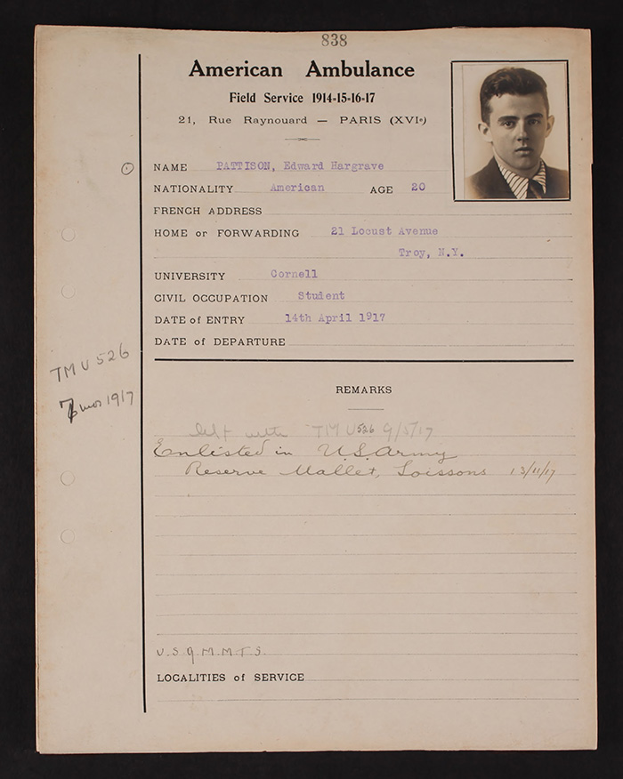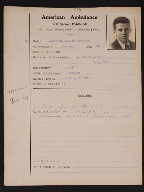 He left for the front from A.F.S. Headquarters at 21 Rue Raynouard on May 9, 1917 as a member of the newly formed Réserve Mallet, at that time a part of the French Army Automobile Service. The Cornell Unit was the first American college unit to be recruited for the camion service of the French Army and Pattison’s unit was the first to fly the American flag on the French front in World War I.