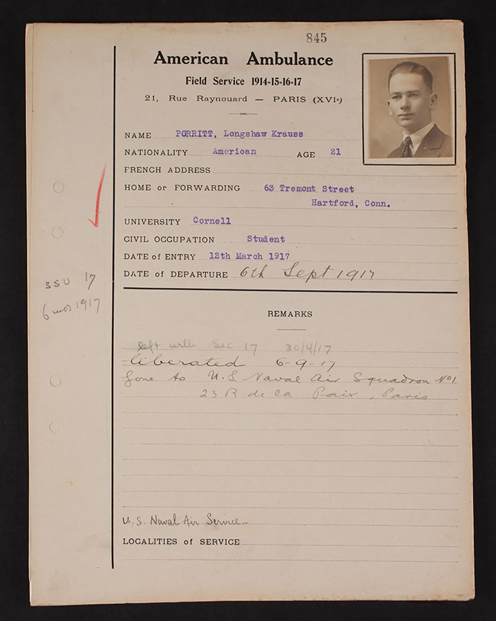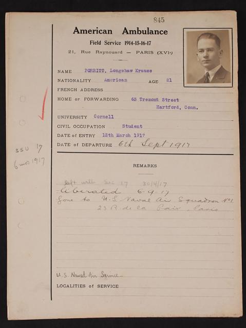 In 1917 he enlisted with the American Field Service, sailing for France in March. Porritt was assigned to SSU 17 and left for the Western Front at the end of April. He was liberated in September and enlisted in the U.S. Naval Air Service. Injured and reconvalescing he was discharged in December 1917 when he joined the ARC in Italy and served as an ambulance driver with Section Four on the Piave River.