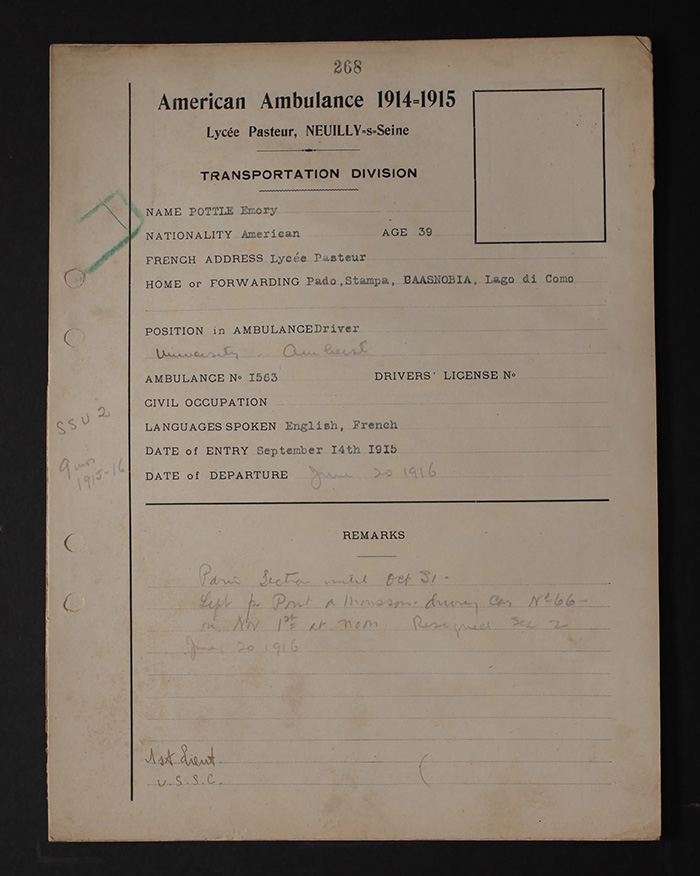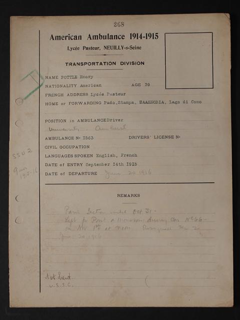 Born Gilbert Emery Bensley Pottle in Naples, N.Y., he joined the Field Service September 14, 1915 under the name Emory Pottle.