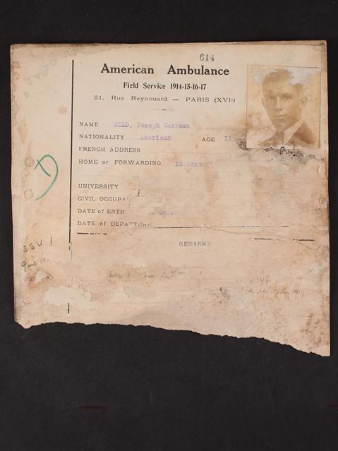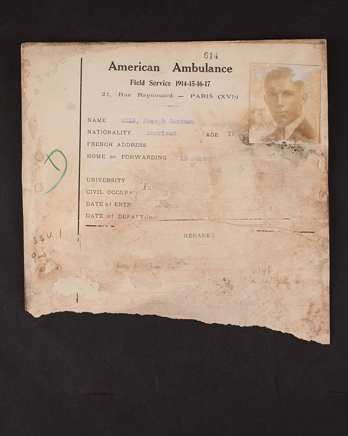 Joseph Garneau Weld, referred to as “Garneau,” was born on March 30, 1897, in St. Louis, Missouri, to William George Weld and Clemence Louise Withington. In late October 1916 Weld became an ambulance driver with Section Sanitaire [Etats-] Unis (SSU) 1 of the American Field Service (AFS), a volunteer ambulance corps serving with the French army during World War I. Weld was with SSU 1 for nine months, until AFS was absorbed by the United States Army and ceased to exist as an independent organization when the U.S. entered the war in 1917. At that time, Weld enlisted as a Private First Class in the United States Army Ambulance Service (USAAS), along with other members of his AFS section, which was renamed SSU 625. He served until the demobilization of the USAAS in 1919.